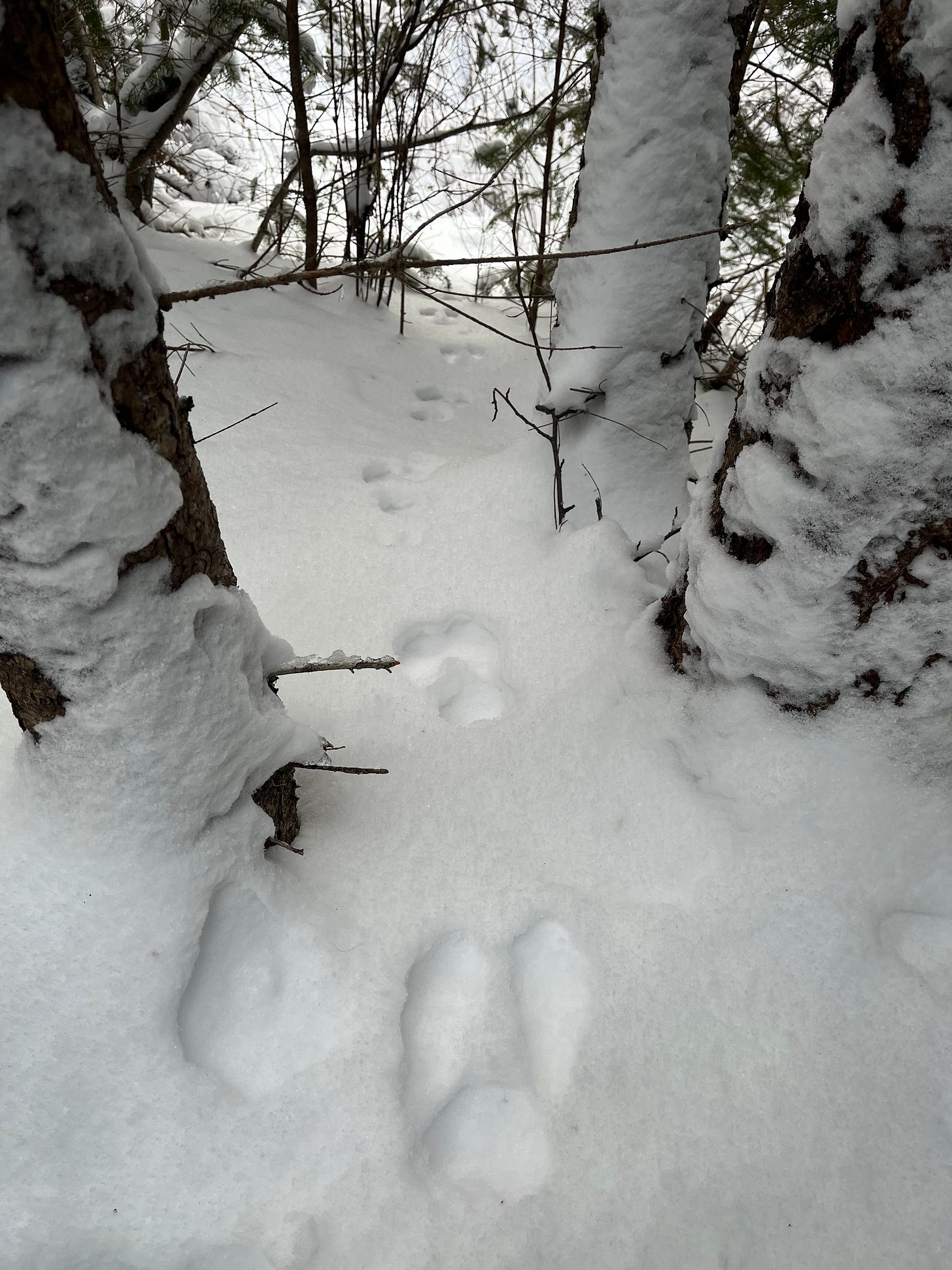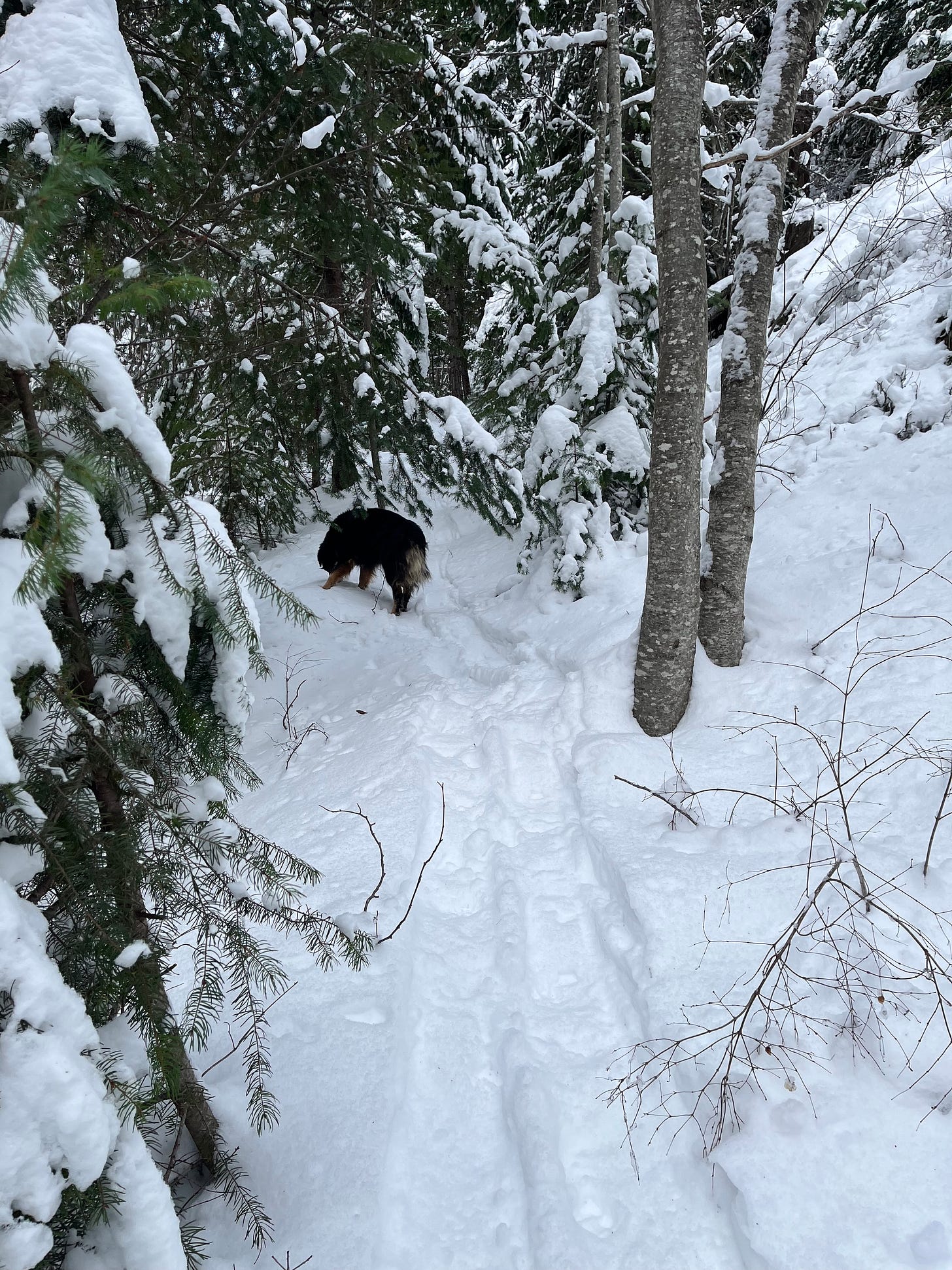The trail I take follows an old logging road that regrew in thick patches of small fir trees, which over the years have been cleared back enough for a trail to snake through. Blackcap brambles poke up through the snow and then dive back in, leaving thorny loops that I try to avoid.
