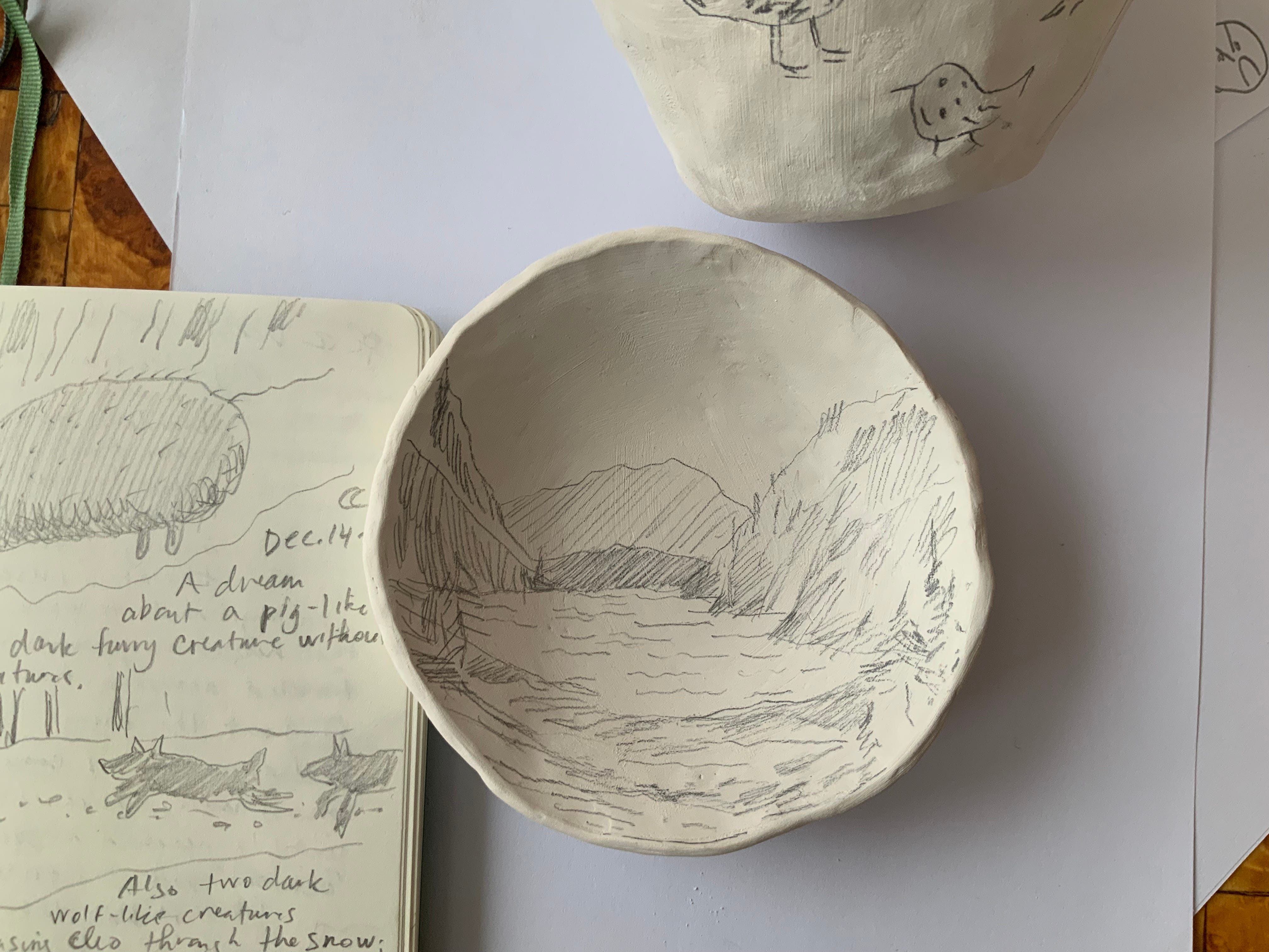 One fun discovery was sketching some of the dream imagery on clay bowls and cups. I don’t have a kiln but I do have three boxes of clay (thank you to my neighbour) and my daughter and I have been learning how to hand build vessels and sketch on uneven surfaces. I am drawn to the idea of the dreams becoming a more permanent thing through the kiln-firing process; from memory to clay to vitrified material.