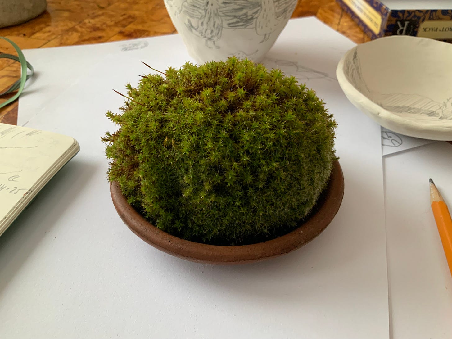The other thing that happened towards the end of the year was remembering that moss is fascinating, and that when it’s removed from roof shingles and gutters as part of house maintenance, I want to replant it. My daughter ran around collecting chunks of roof moss cleaned off the north side of our roof, and the moss now lives in various planters and bowls, and I also want to make some ceramic bowls for future rescue mosses.